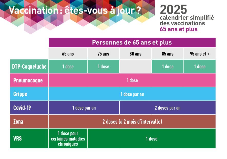 🔹Grippe saisonnière : Vaccination chaque année pour toutes les personnes âgées de 65 ans et plus.