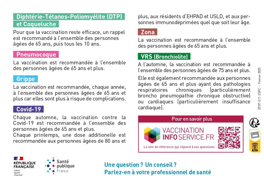 🔹COVID-19 : La vaccination est recommandée à l'ensemble des personnes de 65 ans et plus chaque automne. Au printemps, une dose supplémentaire est recommandée aux personnes âgées de 80 ans et plus, aux résidents d’EHPAD et USLD, et aux personnes immunodéprimées quel que soit leur âge.